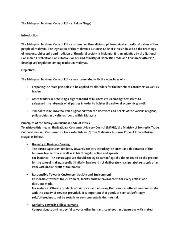 The Malaysian Business Code Of Ethics Rukun Niaga