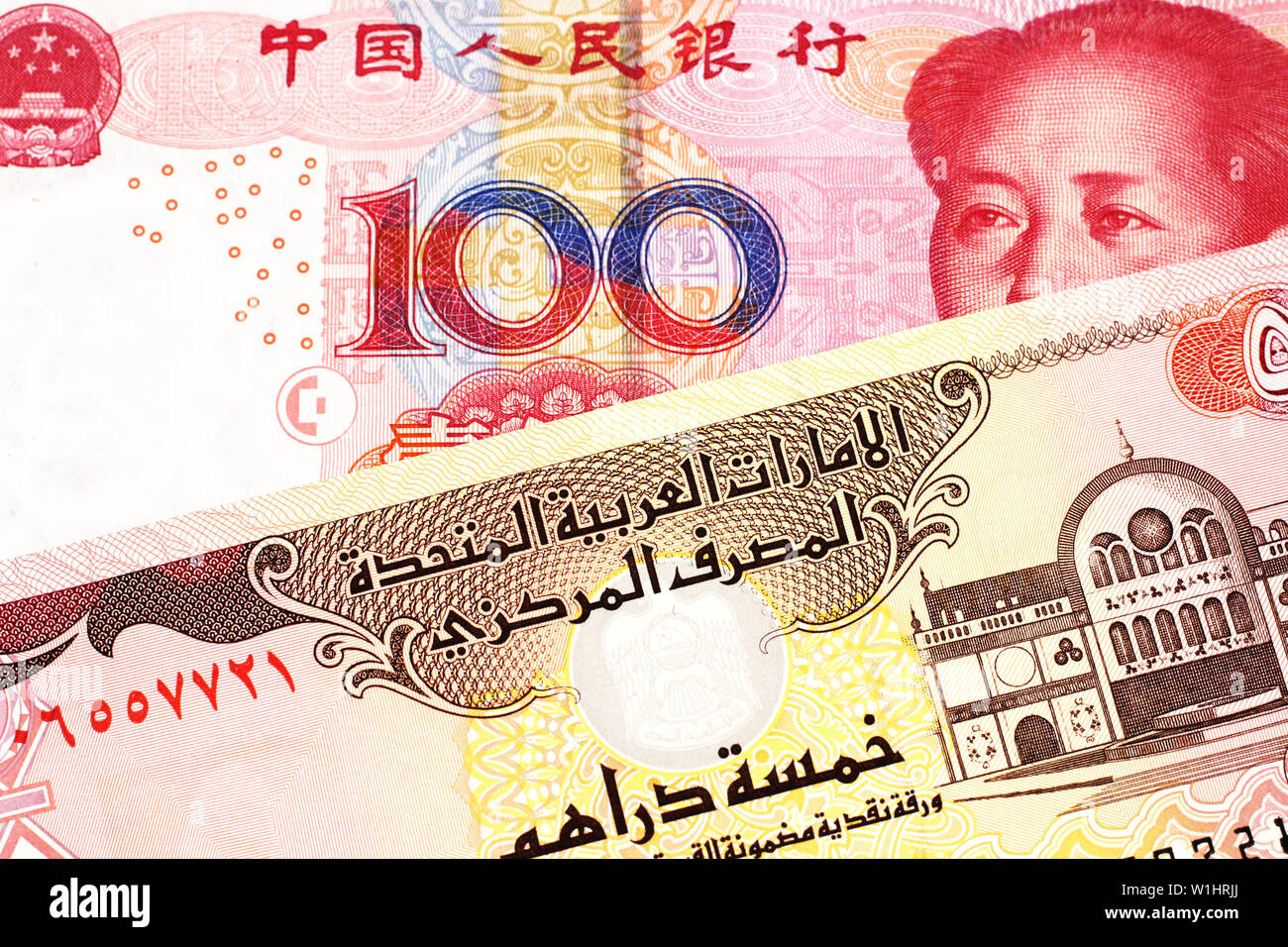 A Red Chinese One Hundred Yuan Renminbi Bank Note With A Five Dirham Bank Note From The United Arab Emirates Close Up In Macro Stock Photo Alamy
