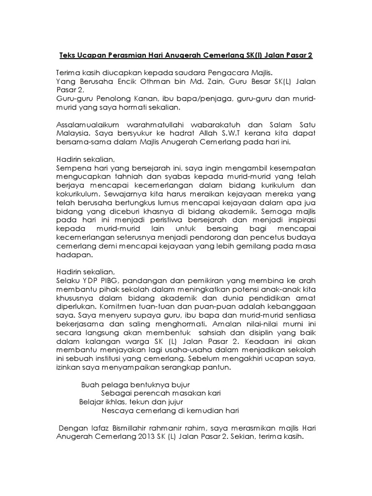 Teks Ucapan Perasmian Hari Anugerah Cemerlang Sk L Jalan Pasar 2 2013